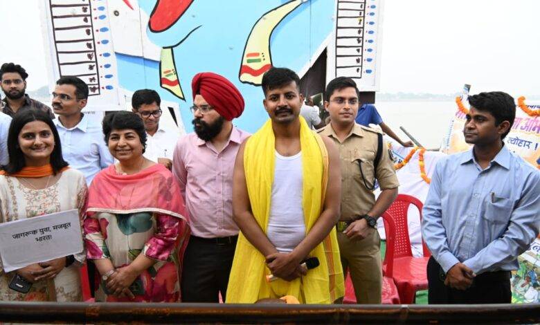 नाव पर SVEEP आइकन अभिराम सुंदर एवं दीक्षा कुमारी द्वारा प्रेरक नारों और संदेशों के माध्यम से लोगों को मतदान हेतु जागरूक किया गया. घाटों पर जनसमूह मंत्रमुग्ध हो उठा यह दृश्य आस्था और लोकतंत्र का अद्भुत संगम बना.