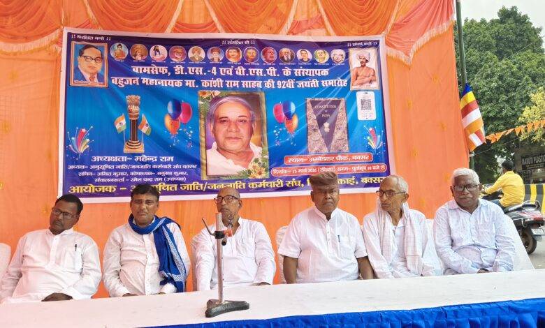 नेशनल आवाज़ /बक्सर :- नगर के अंबेडकर चौक के पास अनुसूचित जाति जनजाति कर्मचारी संघ के तत्वावधान में मान्यवर कांशीराम की 92 वीं जयंती धूमधाम से श्रद्धा पूर्वक मनाई गई. जिसकी अध्यक्षता संघ के अध्यक्ष महेंद्र राम संचालन संघ के उपाध्यक्ष रमेशचंद्र राम ने किया.कार्यक्रम के आरंभ में उनके चित्र पर पुष्प अर्पित कर गगन भेदी नारे लगाए गए.